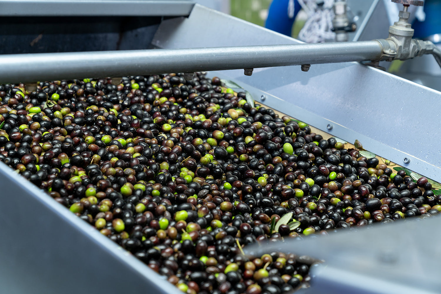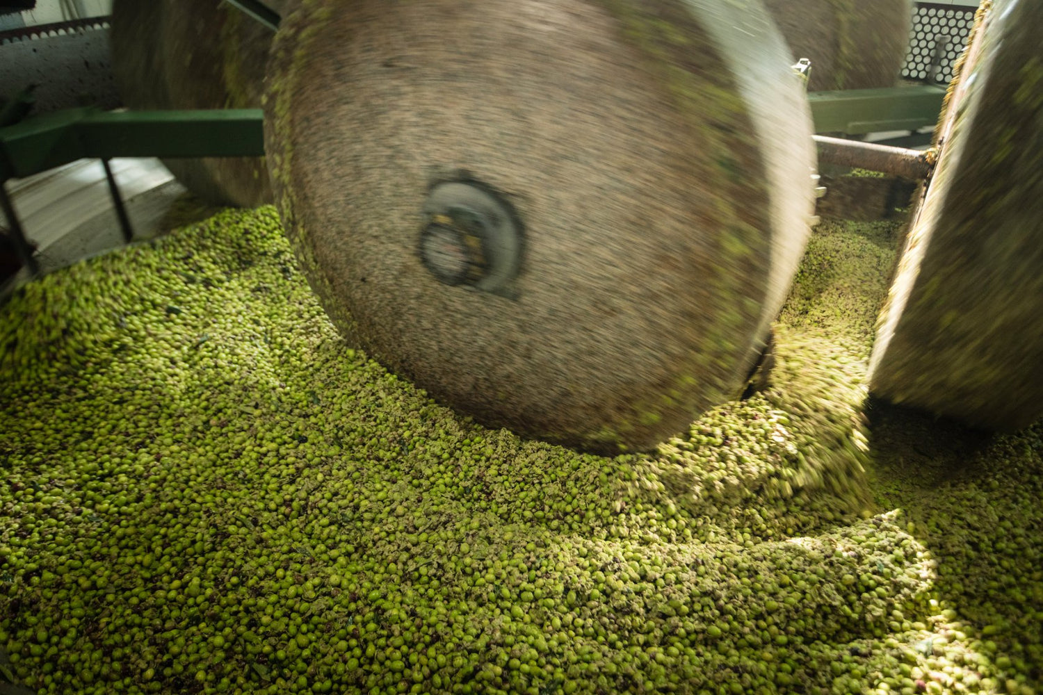 After the washing stage, the olives are transported to a mill that reduces the fruit to paste.