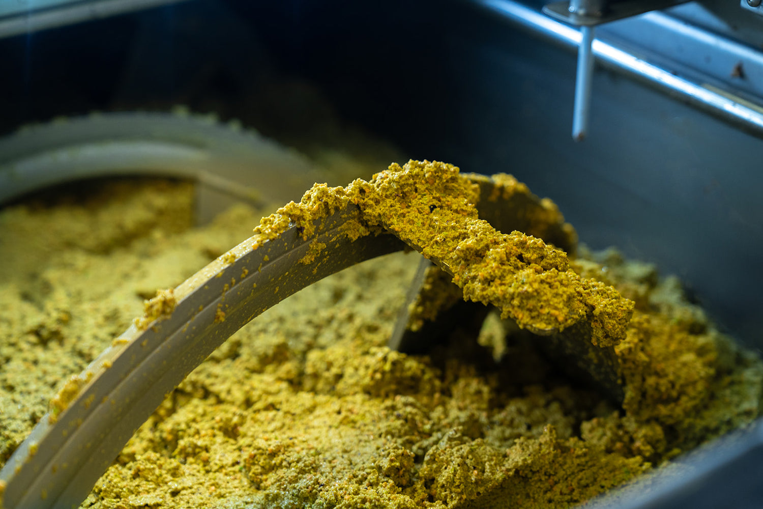 The olive paste is then sent to the kneading machine which, with slow mixing by mechanical blades, breaks the emulsion between the oil and the vegetation water present in the olive.